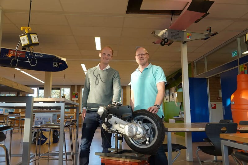 We nemen plaats in de schoolbanken van het met voertuigen, technische werkstukken en motoren gedecoreerde lokaal. Voordat we het hebben over wat het Technasium is, wordt mijn aandacht al getrokken door de kunststoffen boten die aan het plafond hangen. Henri ziet mijn verbazing en oppert: “Mooi hè? Die twee hebben we gemaakt met verschillende partijen voor de Young Solar Challenge, een competitie met zelfgebouwde zonneboten.” Er prijken de stickers op van uiteenlopende partners. Zo hebben de studenten van NHL Stenden, Drenthe College en Hondsrug College eraan gewerkt, maar zijn ook de Emmense Tejin Aramid, Cumapol en Century betrokken bij de zonneboten die de Elfstedentocht hebben gevaren. Vervolgens gaan we met ze in gesprek, en vinden we in de bovenbouw passende projecten die de nieuwsgierigheid van de studenten als prioriteit heeft. Ik merk dat de studenten ook juist van die samenwerkingen heel veel leren, op zowel technisch vlak, als het samenwerken. En daar ben ik dan weer heel trots op”