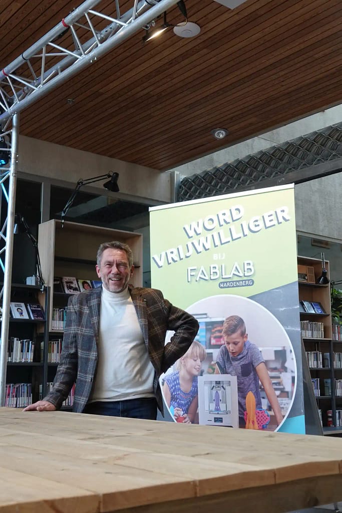 Ik kom aan in het LOC+, en loop de grote welkomsthal binnen waar het bruist met jeugd, mensen die zoeken naar de beste thrillers in de bibliotheek en een speelse inrichting met veel kunst en cultuur. Aan het einde van de hal, bij de grote glazen pui zie ik de eerste banners en posters van het groengekleurde FabLab al staan. ‘Daar zal Gert ergens wel zitten’ denk ik bij mezelf en ik banjer richting een ruimte met grote tafels en krukken, aangekleed door moderne en oude apparatuur. Links en rechts van het ‘open lokaal’ staat er namelijk gereedschap op display, van oude typmachines tot de modernste 3D-printers.